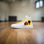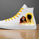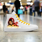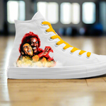 The pristine white canvas provides the ideal background for the vivid, detailed artwork, making these shoes a striking addition to any sneaker enthusiast's collection.