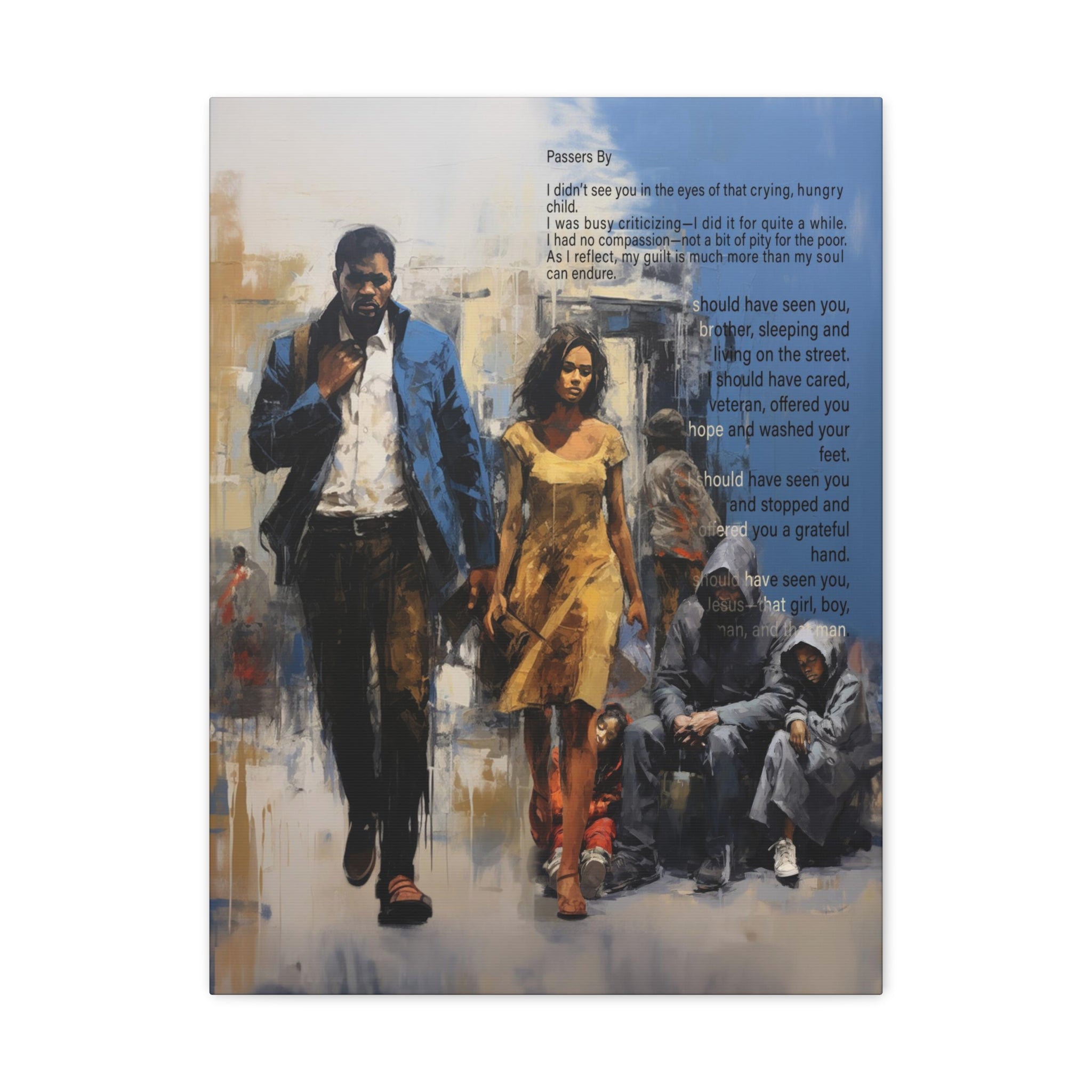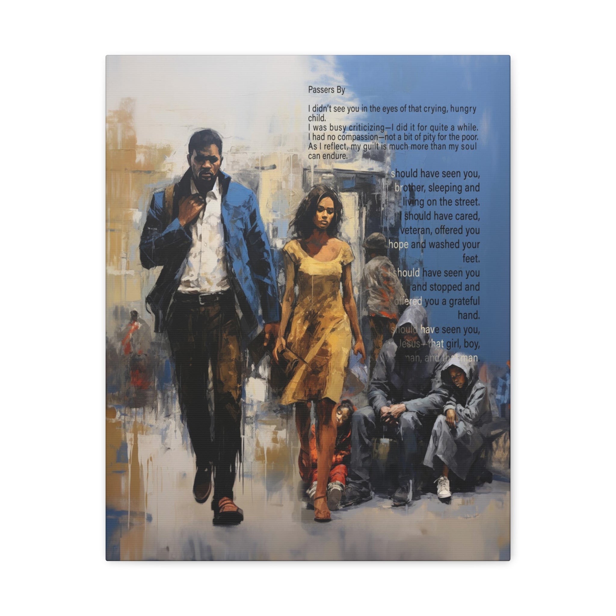 'Passers By' is a beautiful piece of art that speaks to the heart. It is a reminder of our shared humanity and encourages us to be more compassionate and understanding of those who are marginalized in our society.