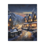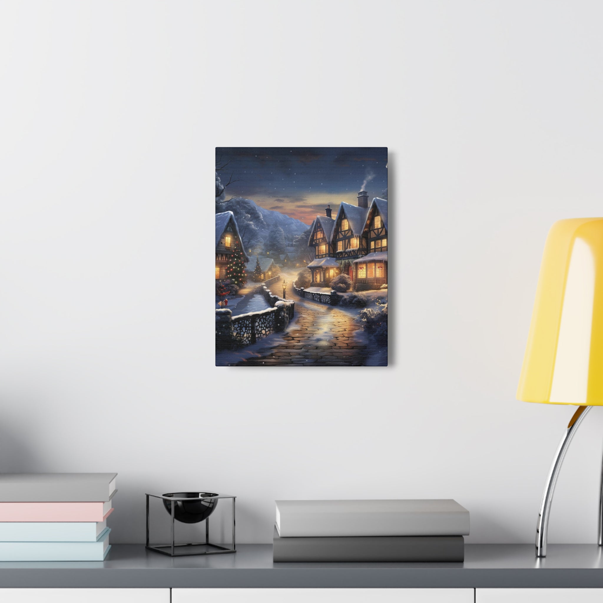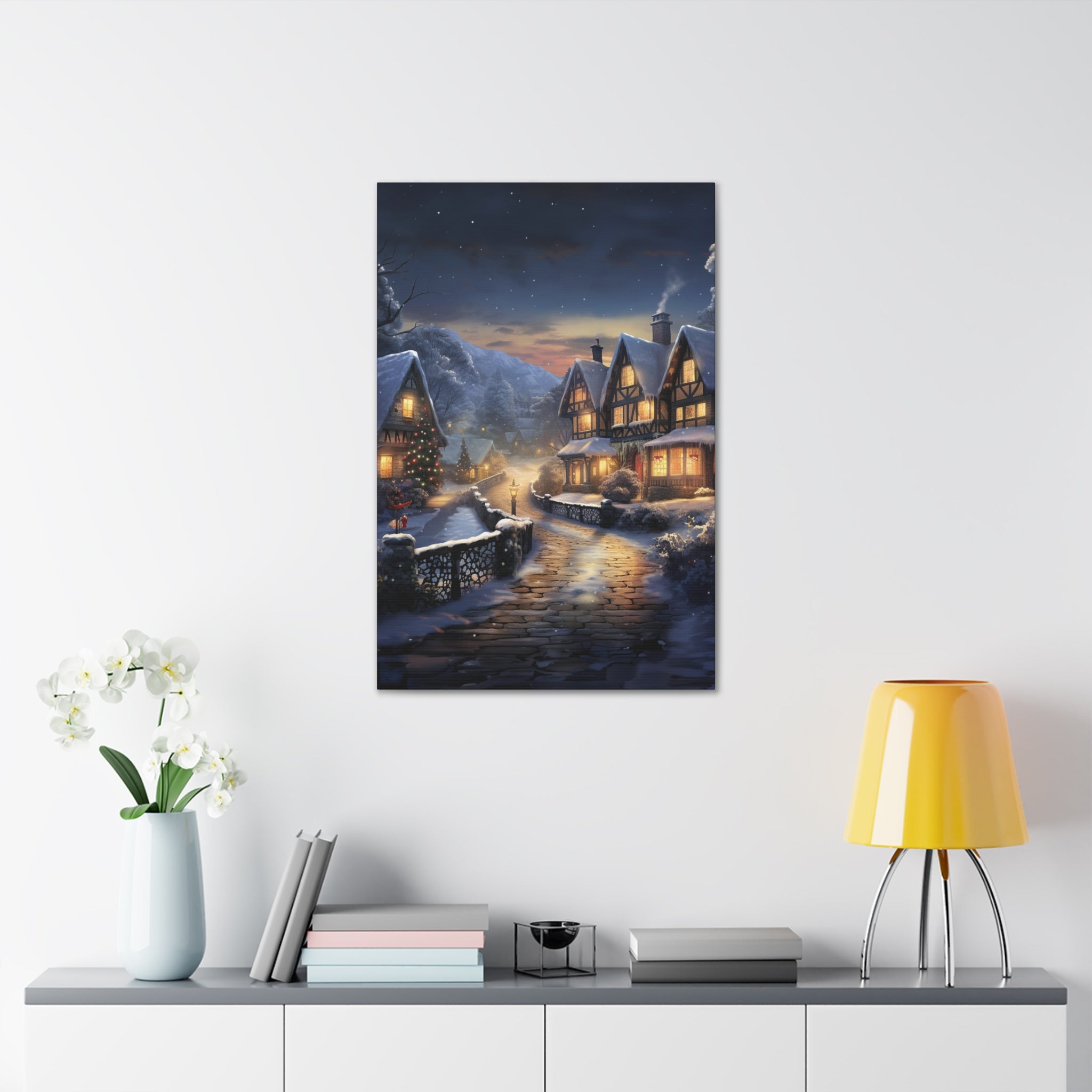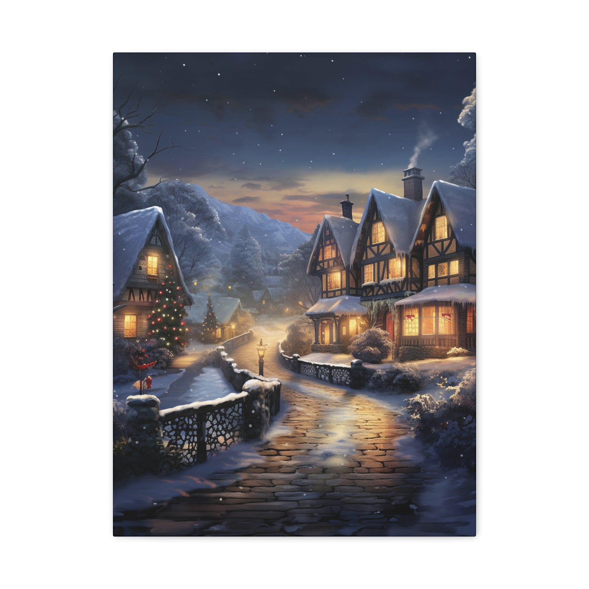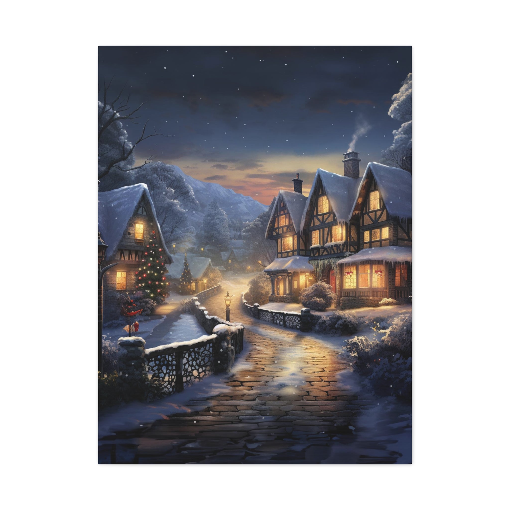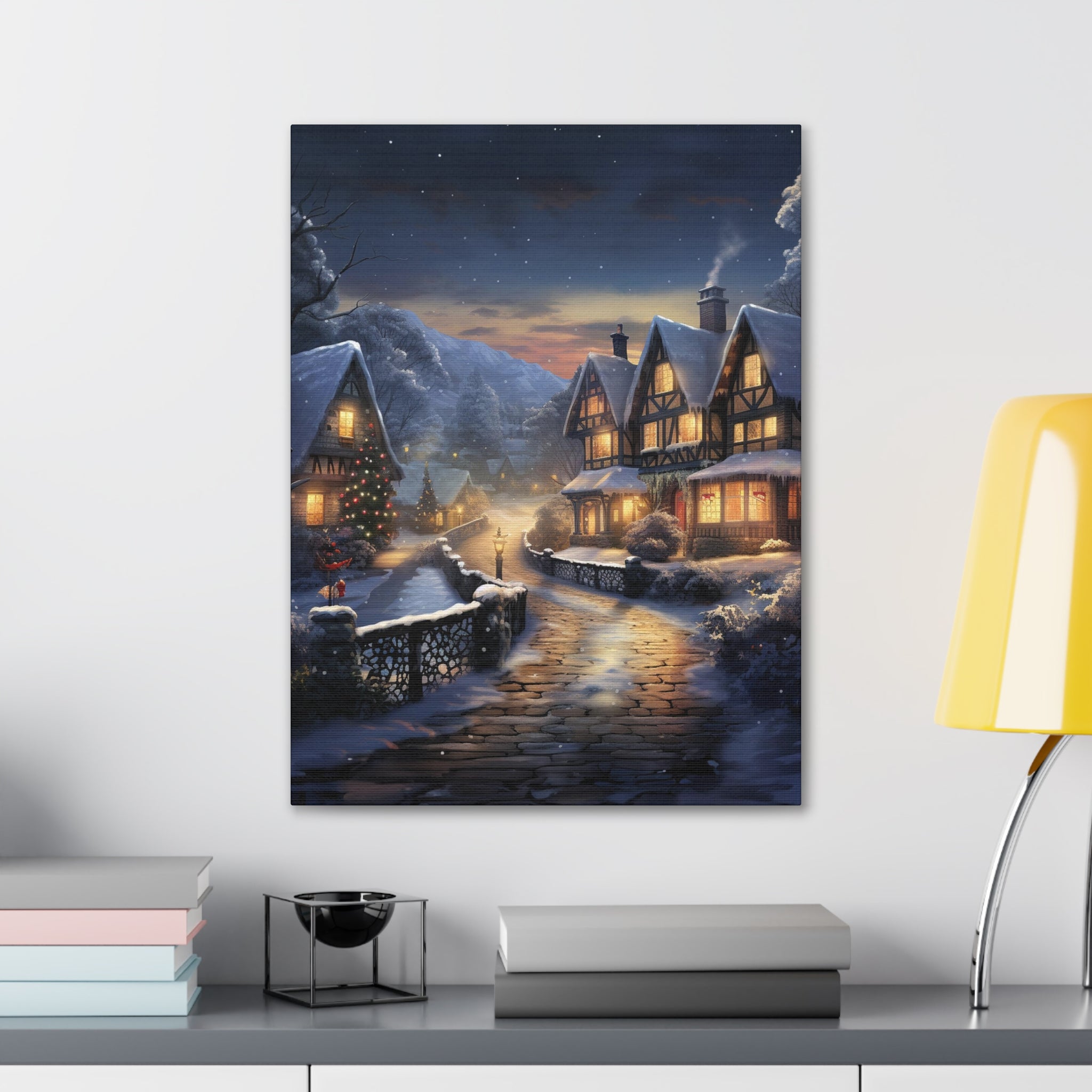 “Winter’s Glow” is an enchanting portrayal of a village embraced by the calm of a snowy evening. The artwork features a row of charming Tudor-style cottages adorned with festive decorations and illuminated by the soft golden light spilling from their windows. A cobblestone path winds through the snow, inviting the viewer to imagine a peaceful stroll through the quiet town. With a backdrop of majestic mountains and a sky dotted with stars, the scene is a testament to the warmth and joy that light up the coldest nights of the year.