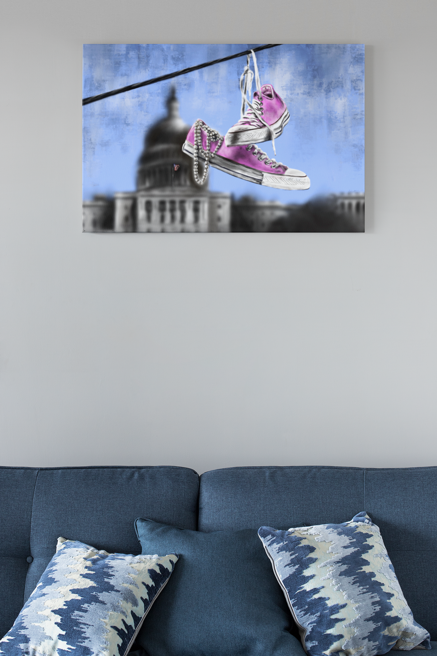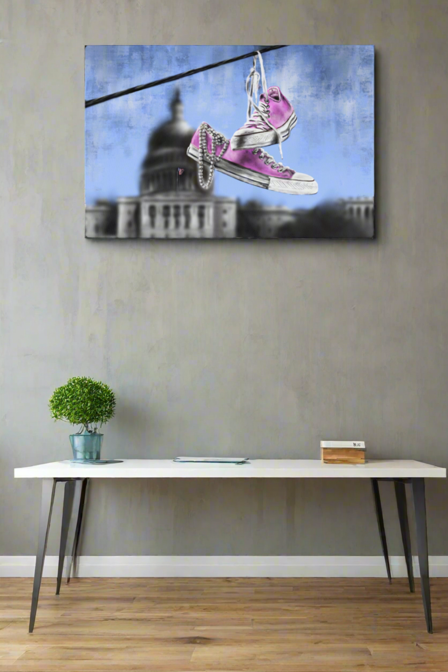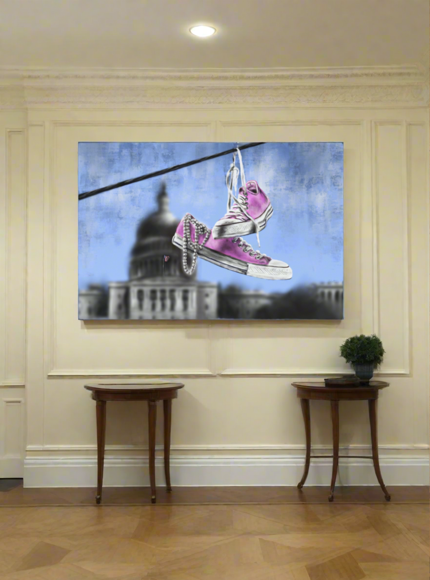 Transform your space with our exclusive "Chucks & Pearls" Limited Edition Canvas. This stunning artwork features a captivating scene of a pair of Chuck Taylor All-Star Converse sneakers adorned with intricate pearl necklaces, hanging against the backdrop of a historic landmark. Inspired by icons of style and empowerment, our Chucks & Pearls canvas is perfect for those who appreciate the finer things in life. Add a touch of elegance and make a statement in your home or office. Key Features: Unique Pearls & Converse Artwork: Handcrafted design that exudes sophistication. High-Quality Canvas: Durable and vibrant print for lasting beauty. Versatile Décor: Ideal for any room or office space. Symbol of Empowerment: Inspired by icons of grace and strength. Get your limited edition canvas today and experience the perfect blend of elegance and art.