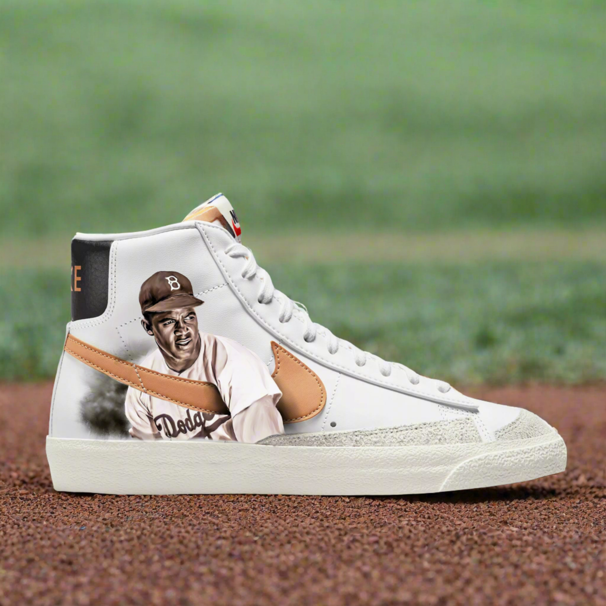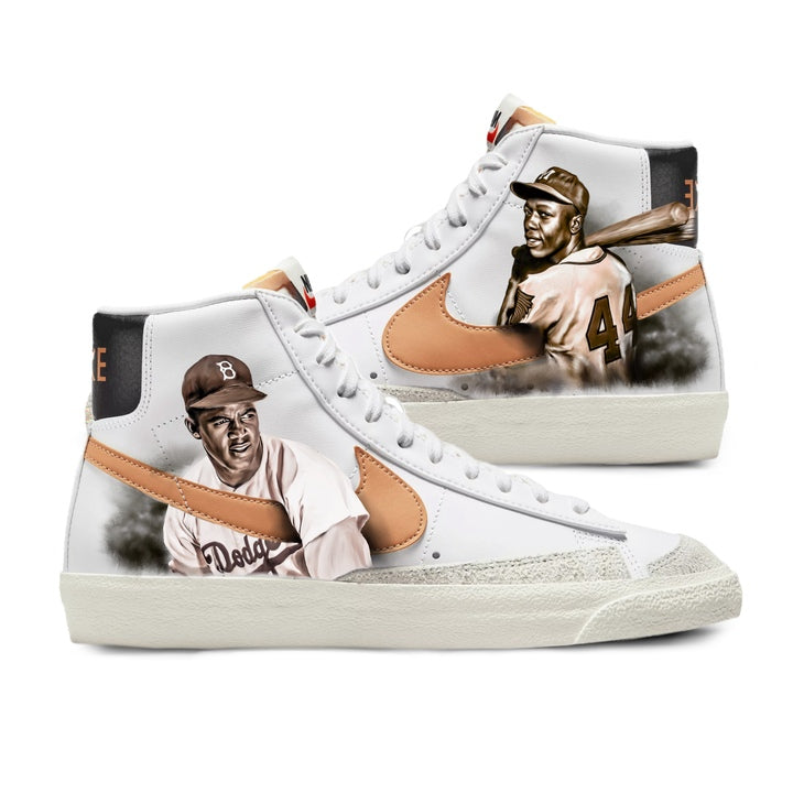 Step into greatness with the "Legends of the Diamond" Nike Blazer Mid '77 sneakers, celebrating the unparalleled legacies of Hank Aaron and Jackie Robinson. These exclusive, one-of-a-kind sneakers feature detailed, hand-painted portraits of two of baseball's most iconic figures, capturing their determined gazes and powerful swings.