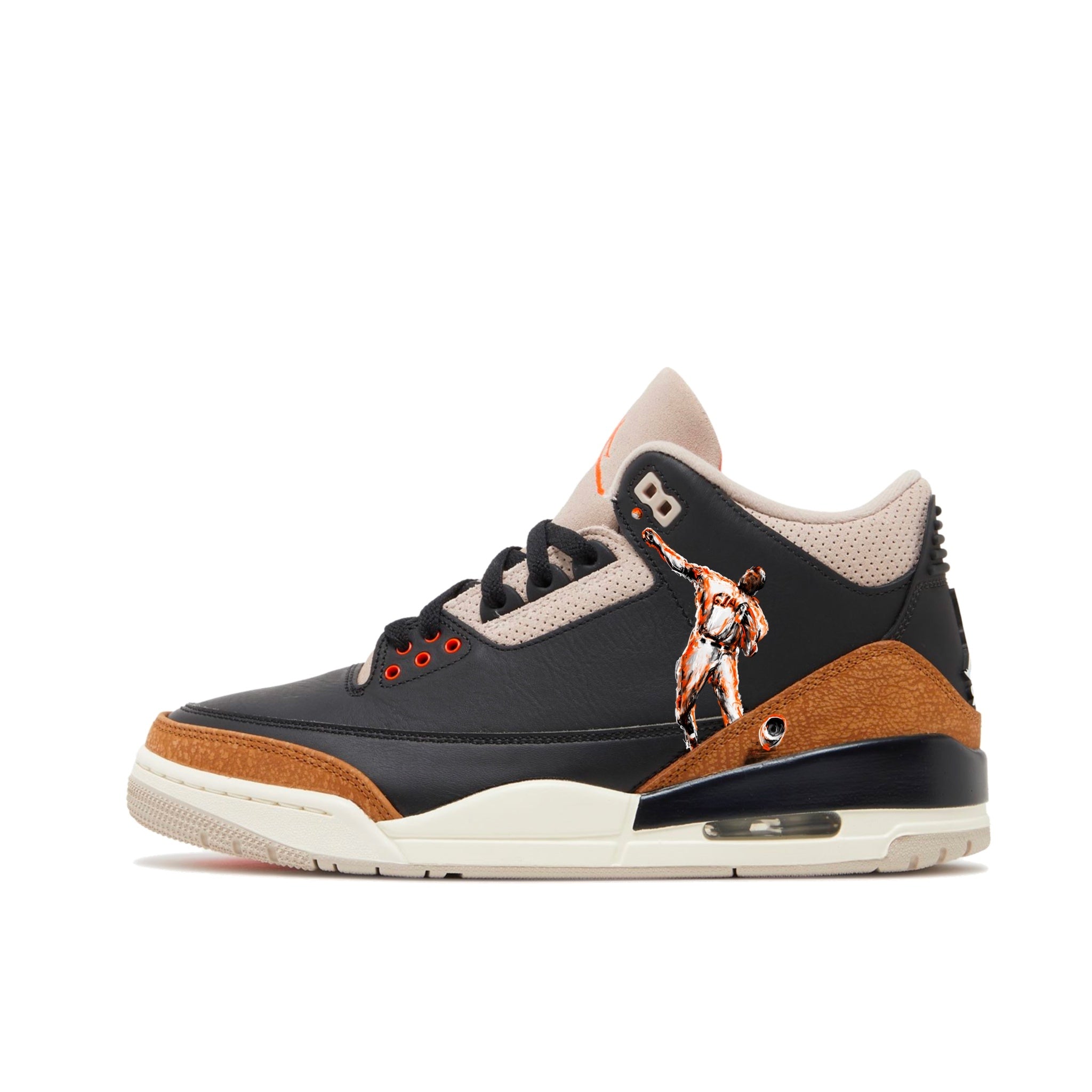 Crafted with premium materials, the "Willie Mays Tribute Jordan 3s" feature striking artwork that captures Mays' unforgettable moments on the field. The high-quality leather upper showcases dynamic images of Mays in action, symbolizing his unmatched athleticism and dedication to the game. The contrasting tones of black, tan, and cream highlight the meticulous design, while the vibrant orange accents pay homage to Mays' storied career with the San Francisco Giants.