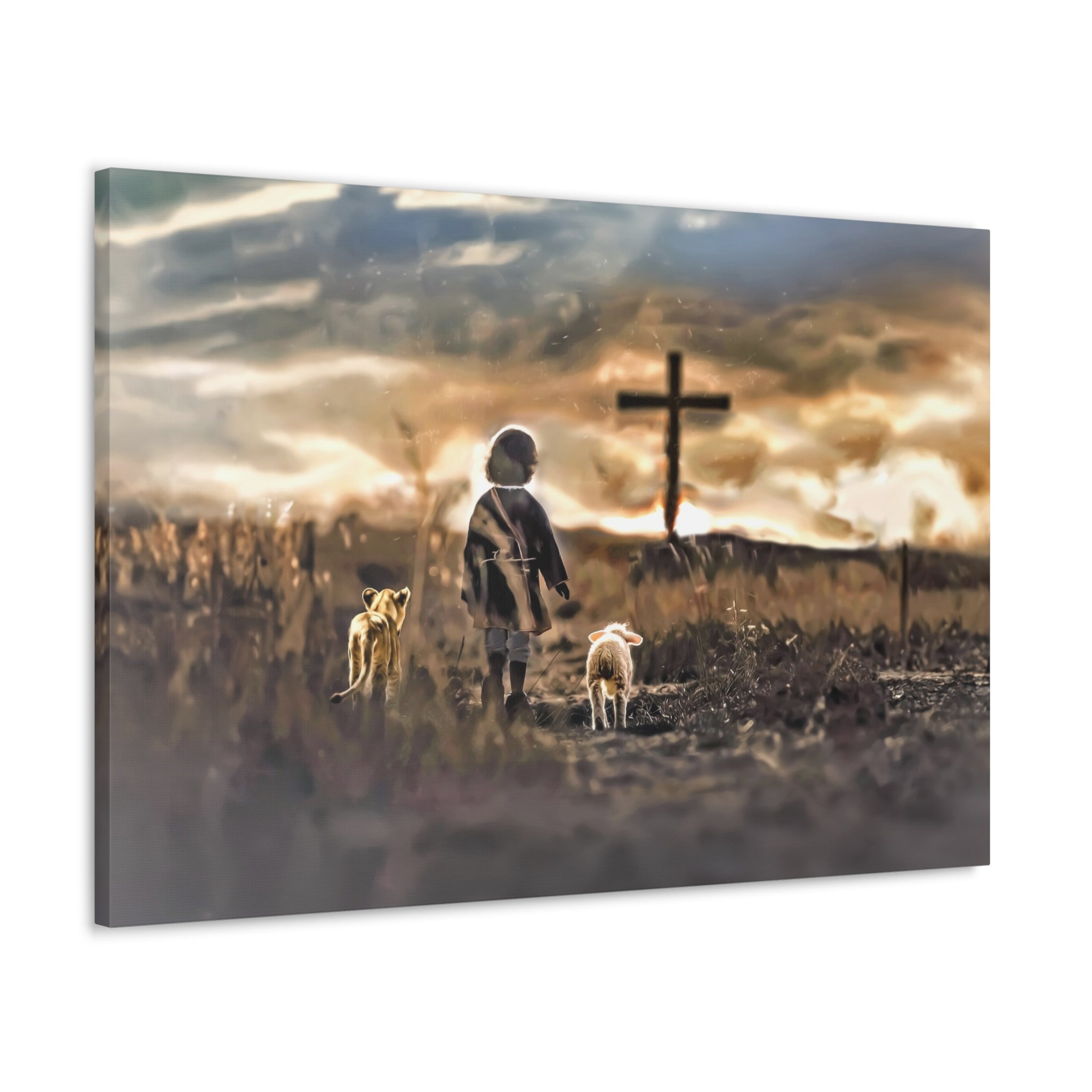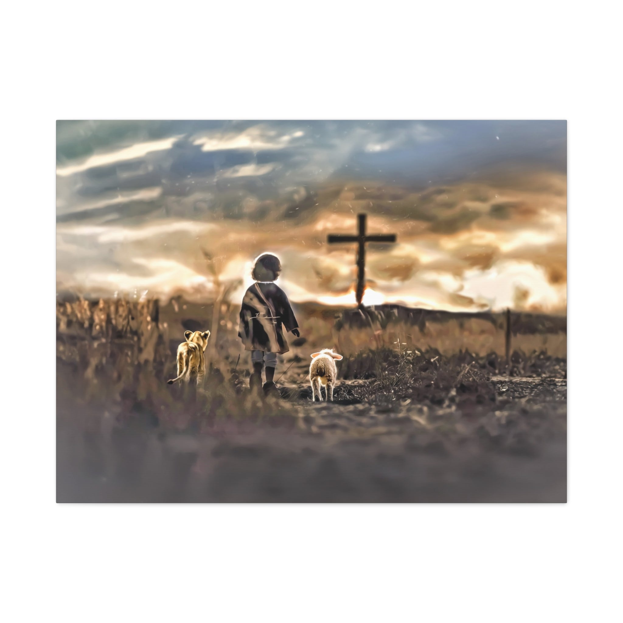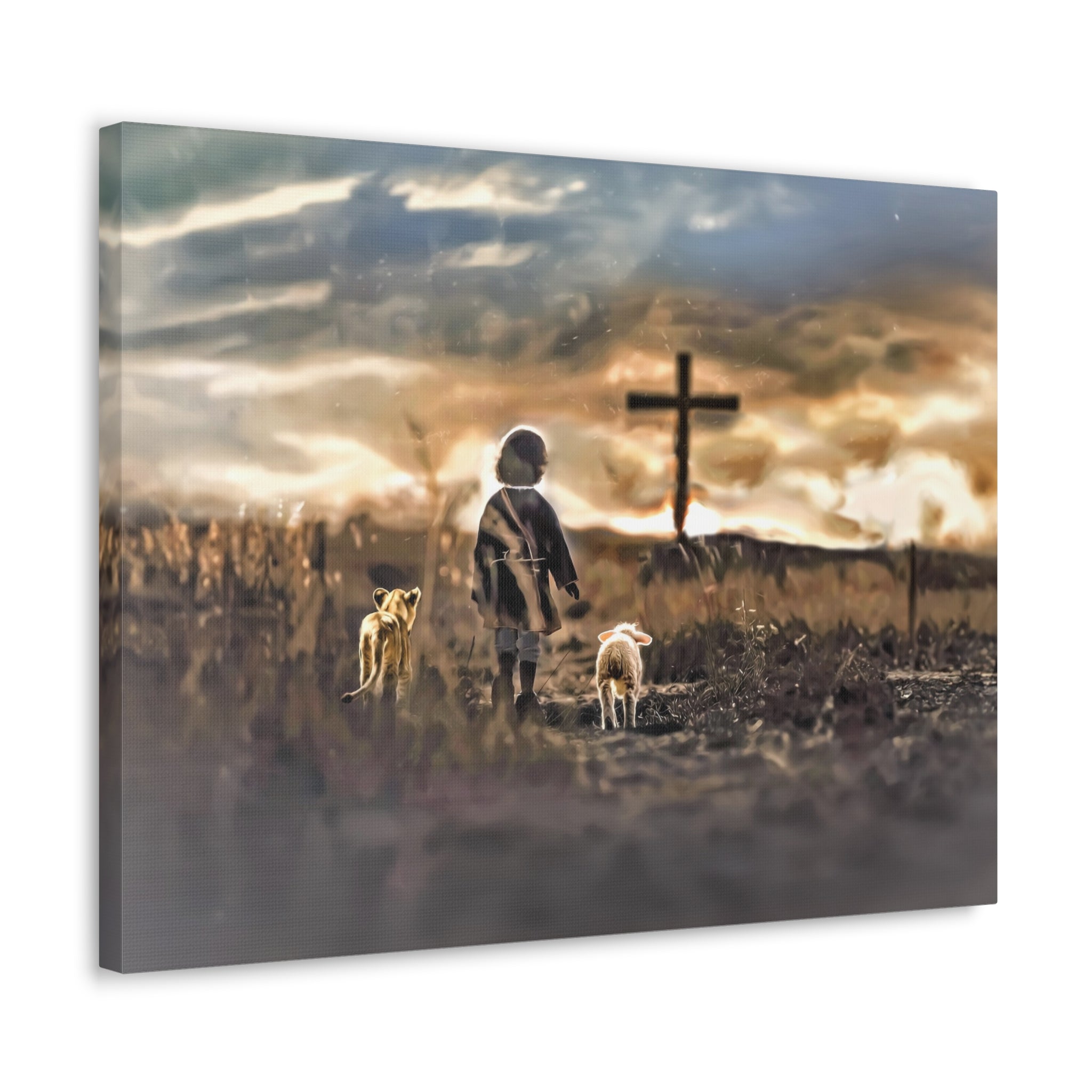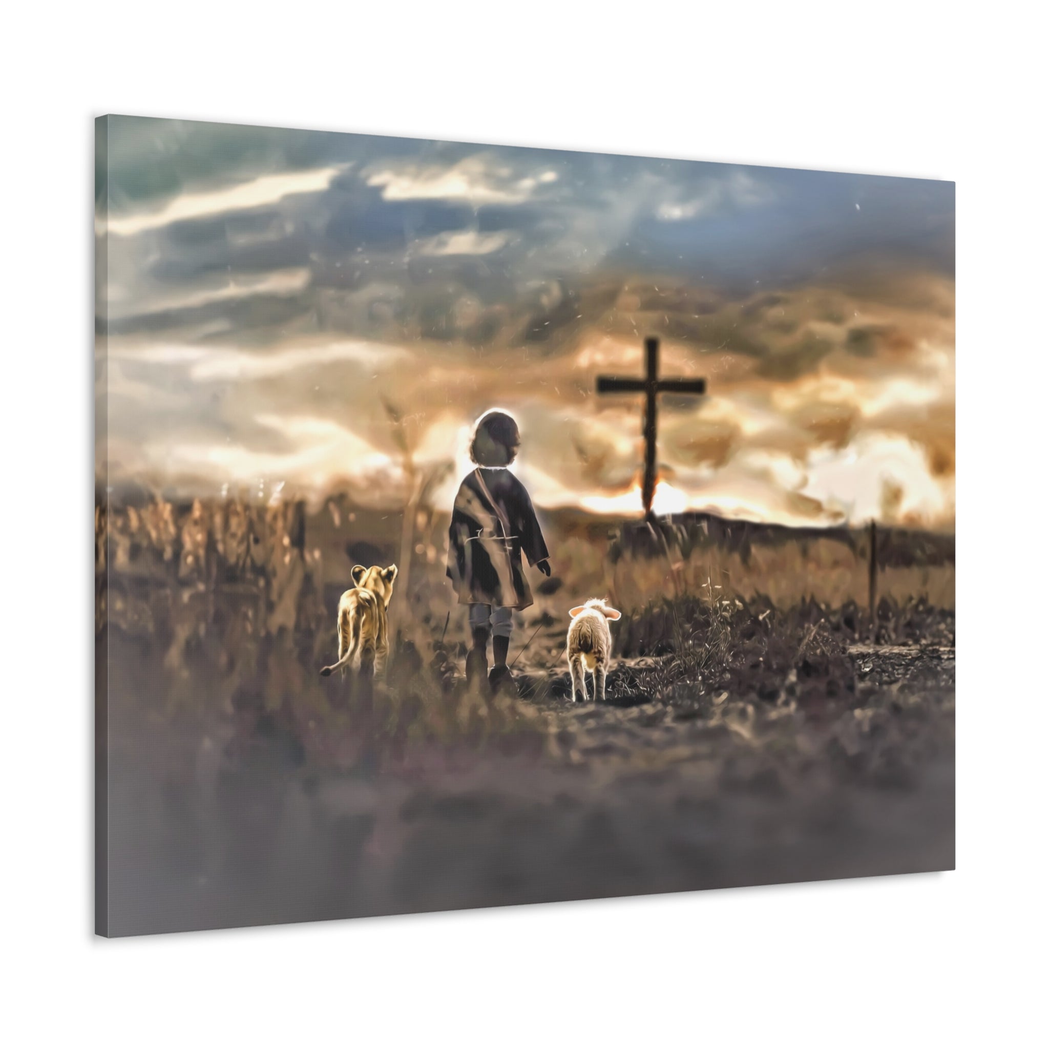 In the soft embrace of twilight, a young Christ treads a path laden with destiny. The painting captures a poignant moment of sacrifice and serenity, as the figure of a small boy, haloed by a resplendent sunset, moves towards a solitary cross that etches a stark silhouette against a tumultuous sky. His companions, a young lion and a lamb, trail gently beside him, symbols of a love fierce and gentle, embodying the dual nature of His mission.
