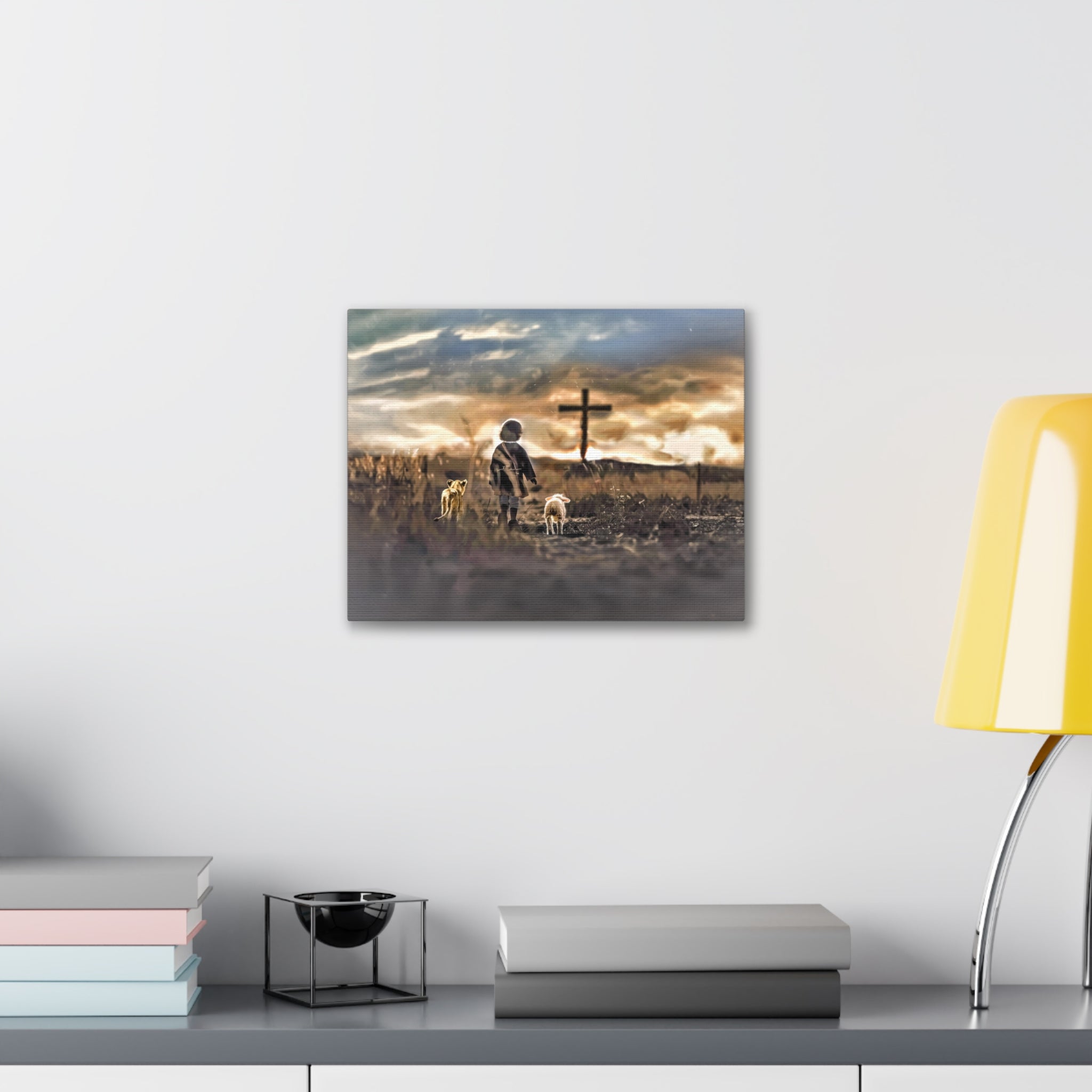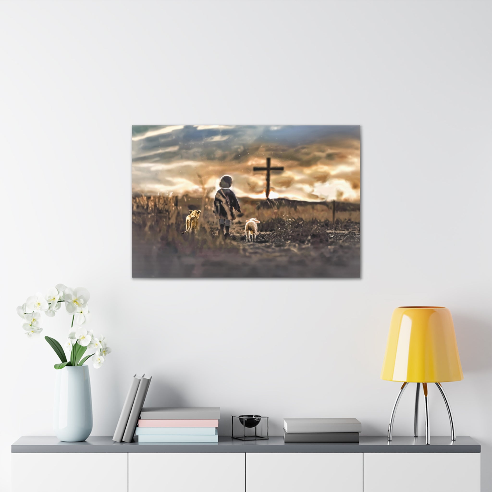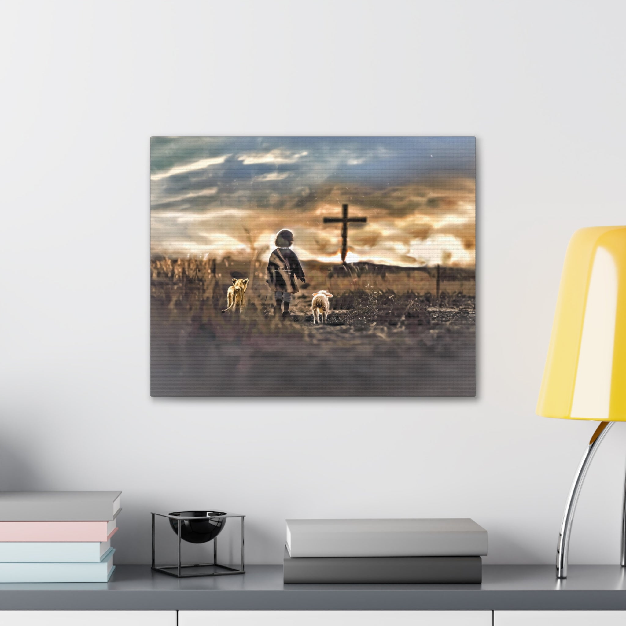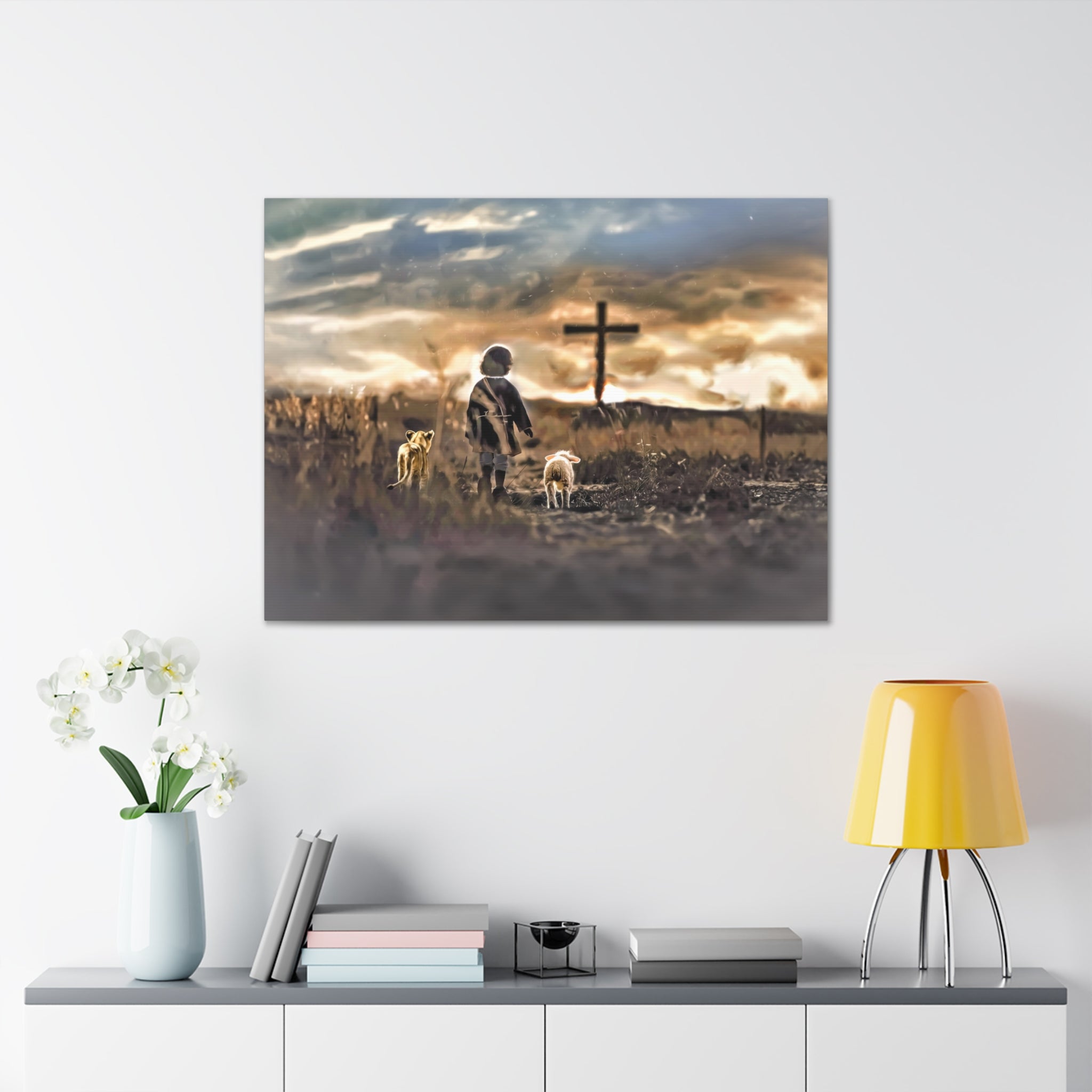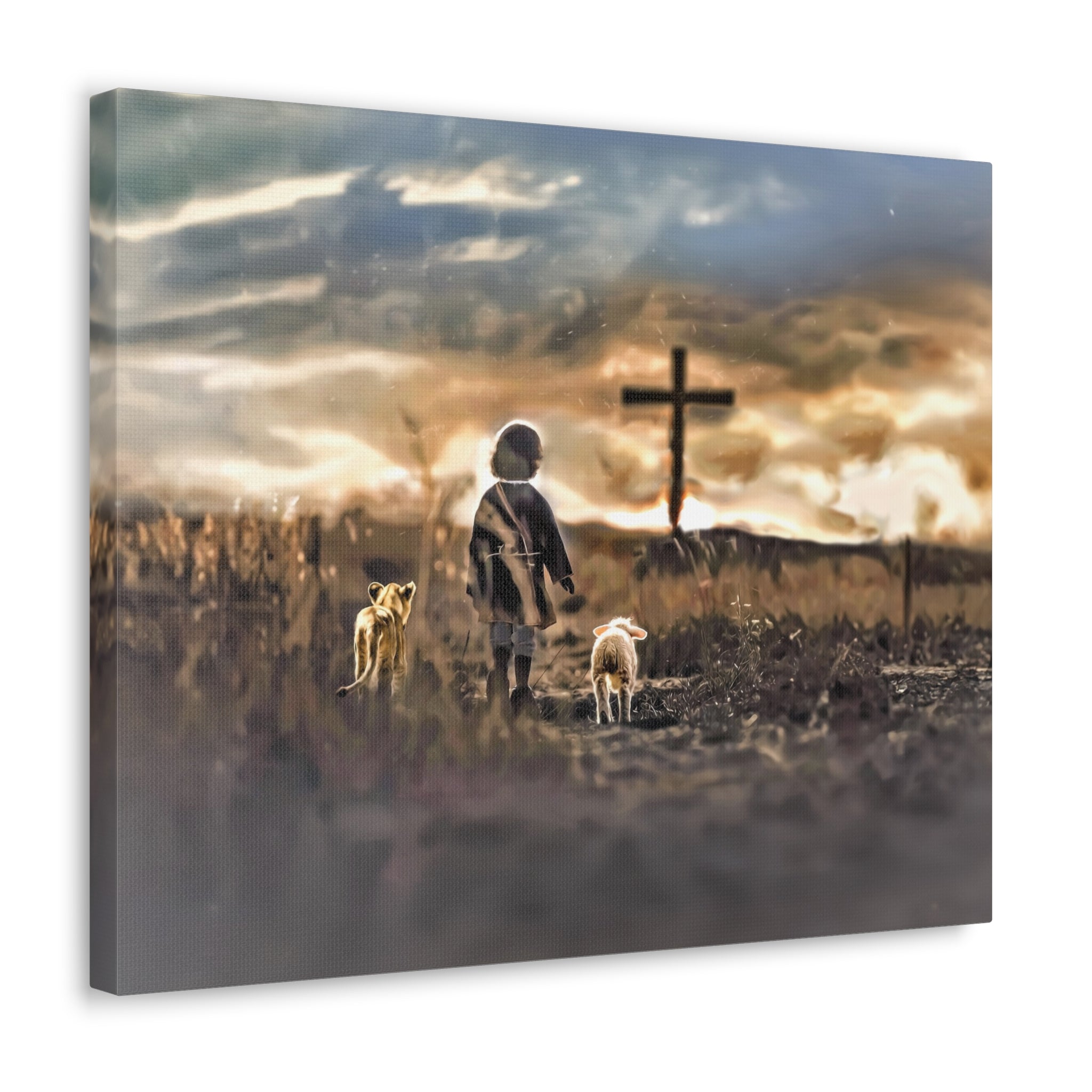 In the soft embrace of twilight, a young Christ treads a path laden with destiny. The painting captures a poignant moment of sacrifice and serenity, as the figure of a small boy, haloed by a resplendent sunset, moves towards a solitary cross that etches a stark silhouette against a tumultuous sky. His companions, a young lion and a lamb, trail gently beside him, symbols of a love fierce and gentle, embodying the dual nature of His mission.