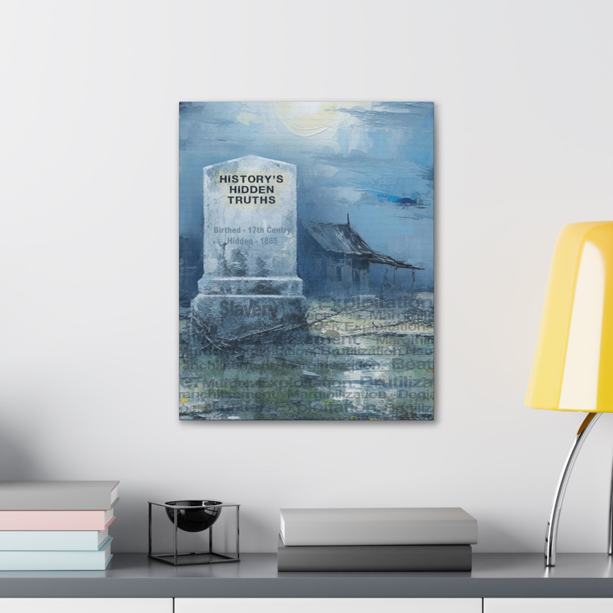 At the center of the canvas, a large headstone symbolizes America’s buried history. In the background, remnants of plantation shacks and slave quarters stand, reflecting a somber reality. In stark contrast, the painting then delves into the shadows, where muted tones and fragmented imagery reveal the untold stories and struggles often overlooked or intentionally hidden. Here, representations of the struggles of African American peoples, the dark legacy of slavery, and the ongoing battles for civil rights emerge. These scenes are intentionally less defined, symbolizing the ongoing process of uncovering and understanding these aspects of history.