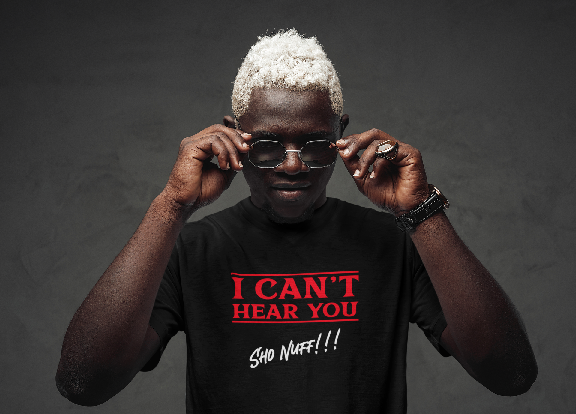 Amplify your presence with the "I Can't Hear You!" T-shirt, inspired by the iconic defiance of Sho' Nuff in "The Last Dragon." This tee is for those who make noise both in style and spirit, demanding to be heard above the rest. Boldly printed with the phrase "I Can't Hear You! Sho' Nuff," it's perfect for those who speak their truth loudly and proudly.