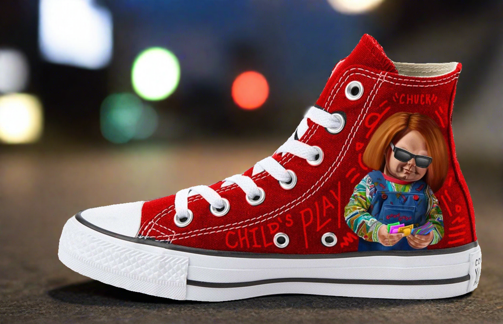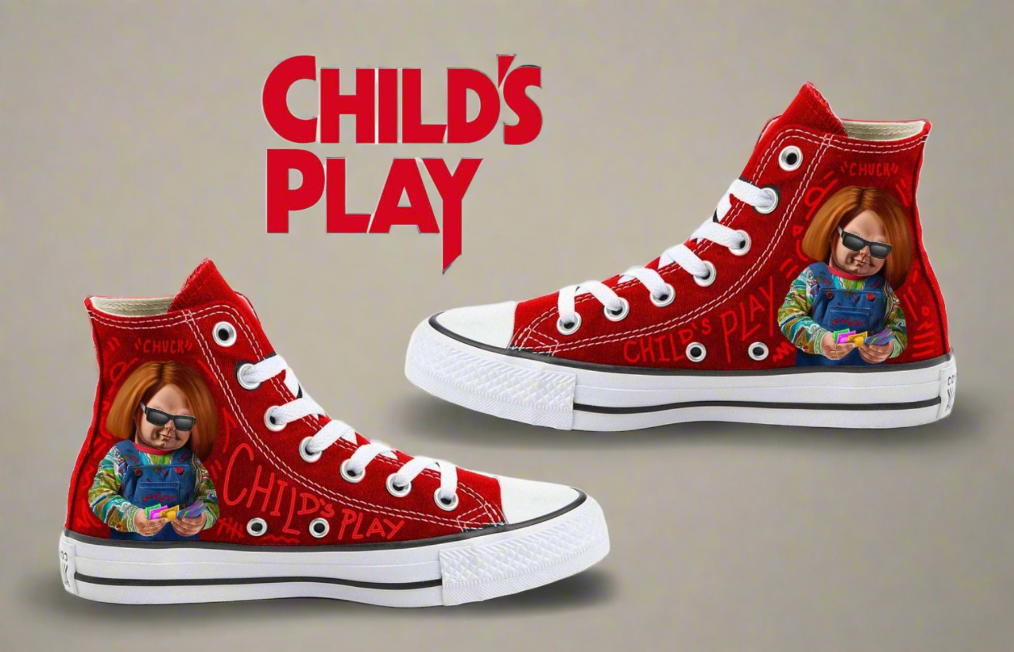 Step into a realm of horror with our exclusive red Chuck Taylor High Tops, boasting original art of the iconic Chucky film 'Child's Play'. These vibrant sneakers are not just a nod to a cult classic, but also a masterpiece crafted with precision and passion.